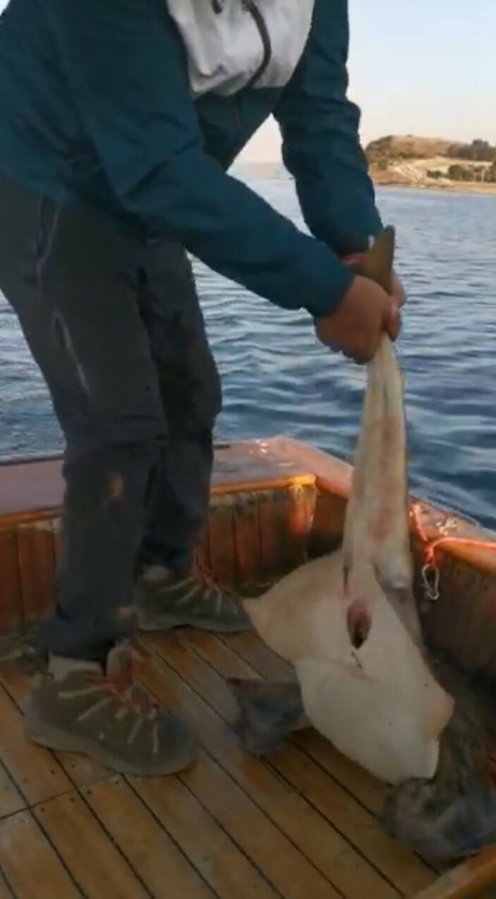Tekne içinde 7 tane yavru doğuran köpek balığının o anlarını balıkçılar cep telefonu kameralarıyla görüntüledi. Sportif balıkçılar yavru balıkları ve doğan köpek balığı denize bıraktılar.