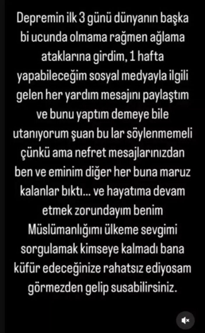“Depremin ilk 3 günü dünyanın başka bir ucunda olmama rağmen ağlama ataklarına girdim, 1 hafta yapabileceğim sosyal medyayla ilgili gelen her yardım mesajını paylaştım ve bunu yaptım demeye bile utanıyorum şu an.