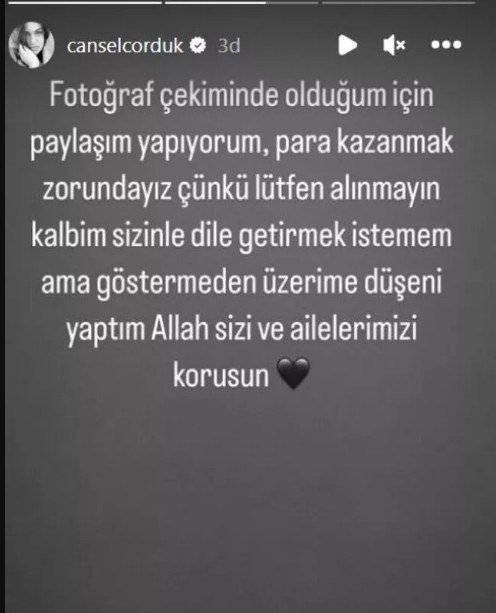 “Fotoğraf çekiminde olduğum için paylaşım yapıyorum, para kazanmak zorundayız çünkü lütfen alınmayın kalbim sizinle dile getirmek istemem ama göstermeden üzerime düşeni yaptım.”