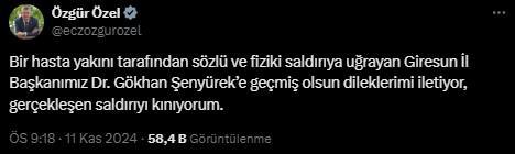Konu hakkında CHP Genel Başkanı Özgür Özel, sosyal medya hesabından bir açıklama yaptı. Özel, açıklamasında, “Bir hasta yakını tarafından sözlü ve fiziki saldırıya uğrayan Giresun İl Başkanımız Dr. Gökhan Şenyürek’e geçmiş olsun dileklerimi iletiyor, gerçekleşen saldırıyı kınıyorum.” ifadelerini kullandı.