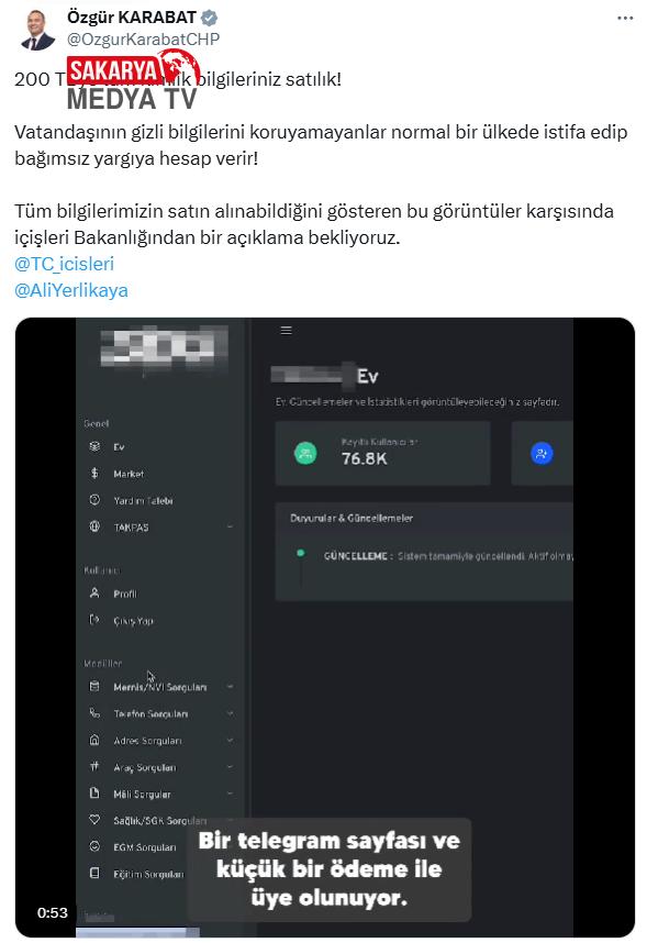 Karabat, İçişleri Bakanlığı ve bakan Ali Yerlikaya’yı etiketleyerek açıklama beklediklerini belirtti ve ekledi: “200 TL’ye tüm kimlik bilgileriniz satılık! Vatandaşının zımnî bilgilerini koruyamayanlar olağan bir ülkede istifa edip bağımsız yargıya hesap verir!”