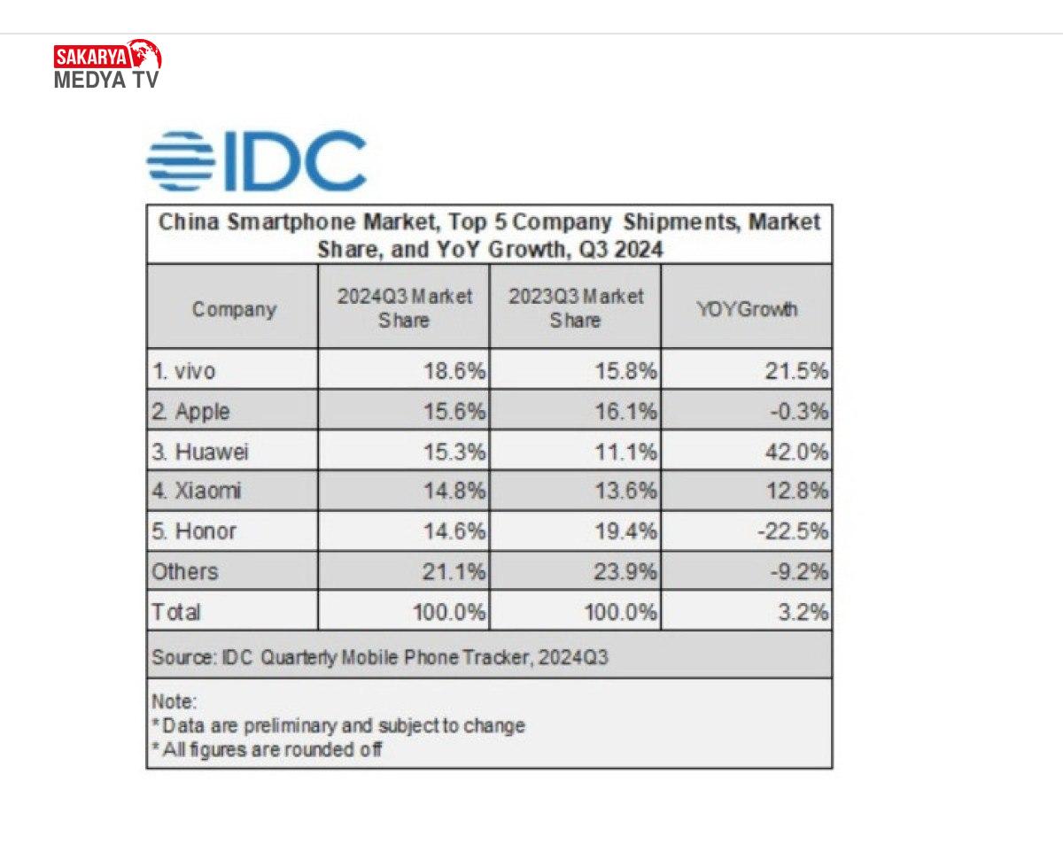 Huawei ise 2024’ün 2. çeyreğinde ikinci sırada yer alırken, 3. çeyrekte üçüncü sıraya geriledi. Buna karşın, şirketin sevkiyatları 2023’ün 3. çeyreğine nazaran yüzde 42 arttı.