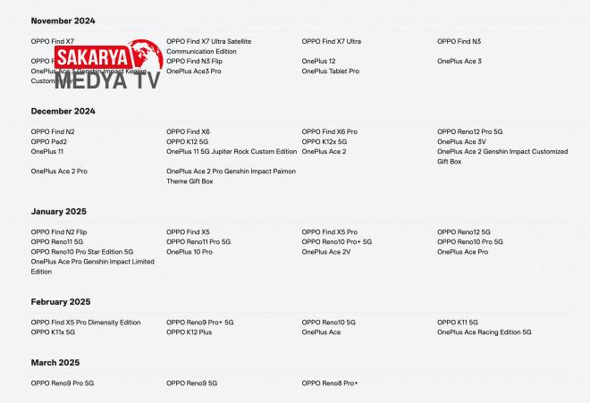 Find X7 serisi, Find N3, Find N3 Flip ve OnePlus Ace 3 serisi gibi eski modeller Kasım ayından itibaren güncellemeyi alacak.