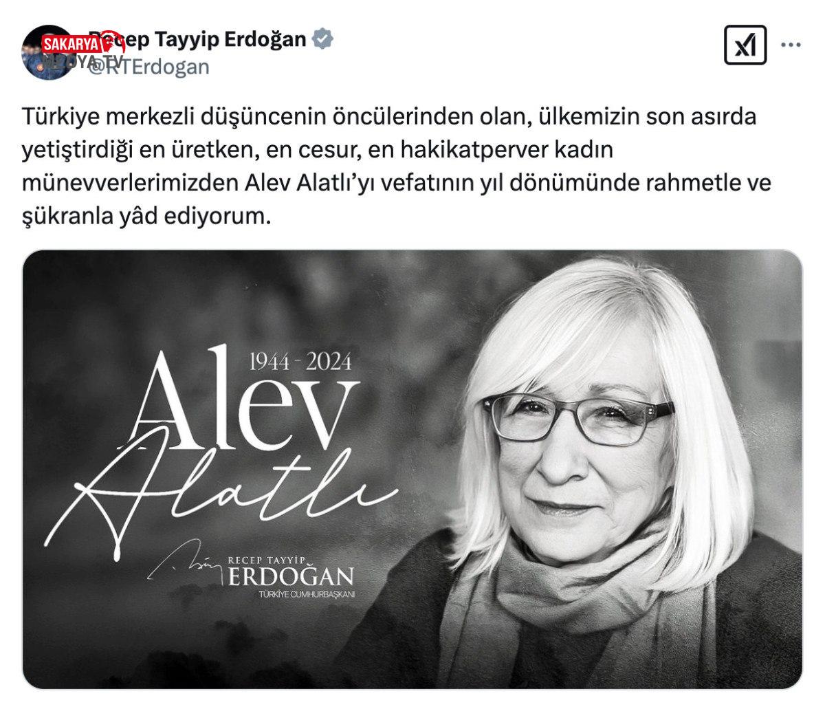Cumhurbaşkanı Recep Tayyip Erdoğan, muharrir Alev Alatlı’yı vefatının birinci yılında toplumsal medya hebasından yayınladığı bir iletiyle andı.