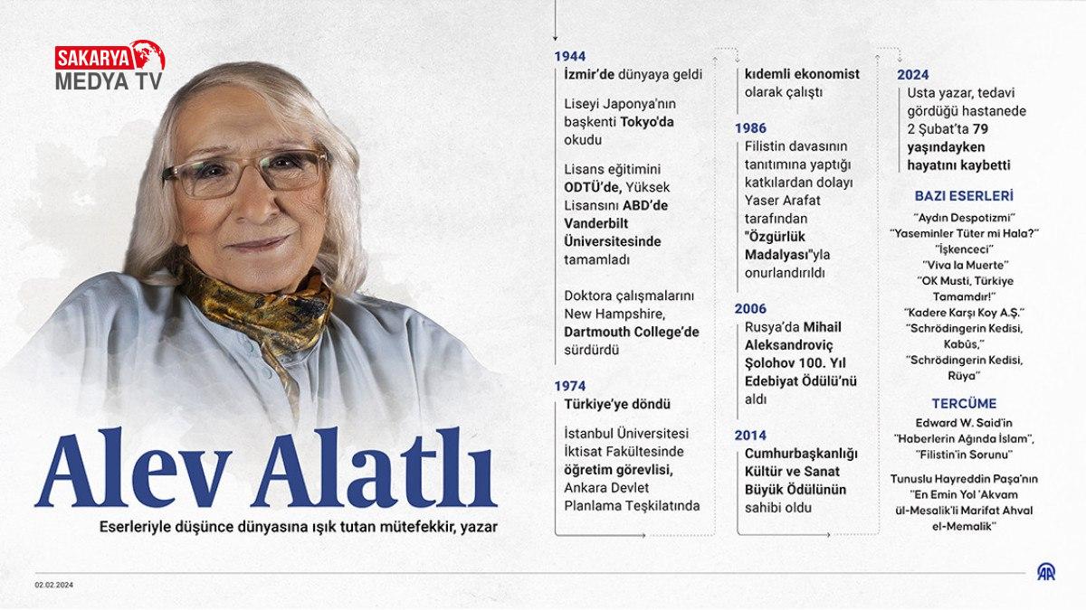“Yaseminler Tüter mi, Hâlâ?”, “İşkenceci”, “O.K Musti Türkiye Tamamdır” ve “Schrödinger’in Kedisi”nin de ortalarında olduğu çok sayıda yapıta imza atan muharrir Alev Alatlı, 79 yaşında tedavi gördüğü hastanede 2 Şubat 2024’te hayatını kaybetti.