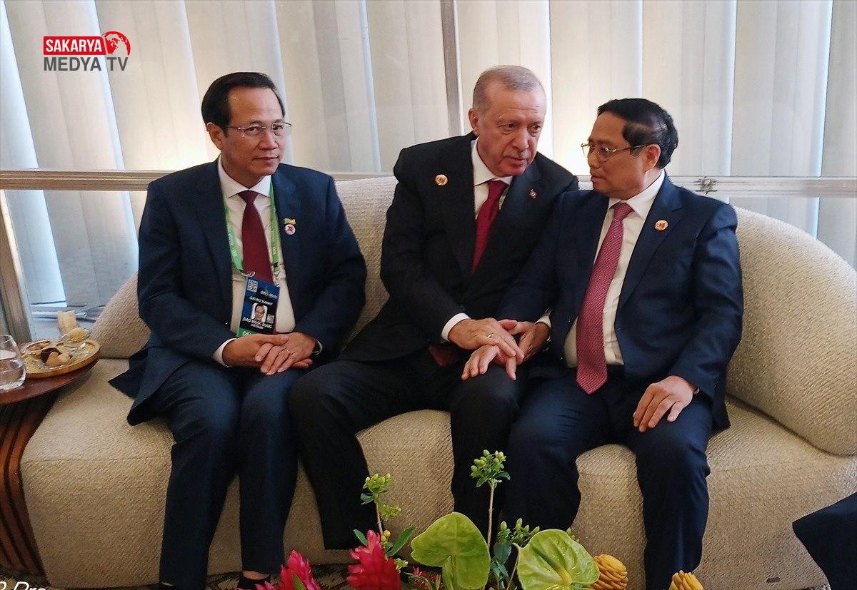 Cumhurbaşkanı Erdoğan’ın başkanlarla olan görüşmelerinde kameralara yansıyan samimi imajlar dikkatlerden kaçmadı. Cumhurbaşkanı Erdoğan tepe kapsamında Vietnam Başbakanı Pham Minh ile sohbet etti.