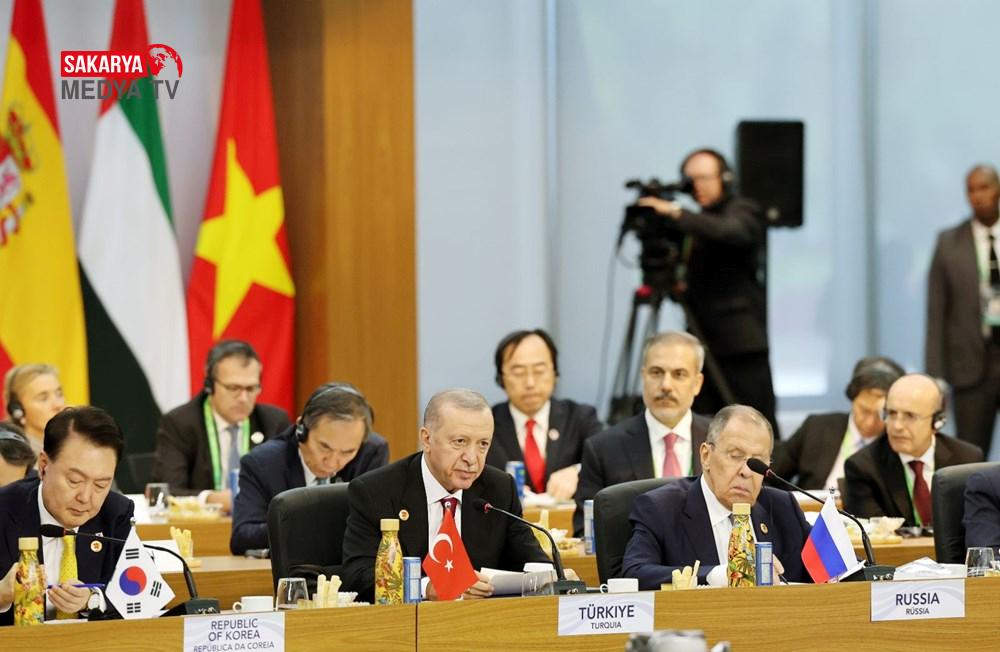 Erdoğan salonda, Güney Kore Devlet Başkanı Yun Suk Yeol ve Rusya Dışişleri Bakanı Sergey Lavrov ile yan yana oturdu.