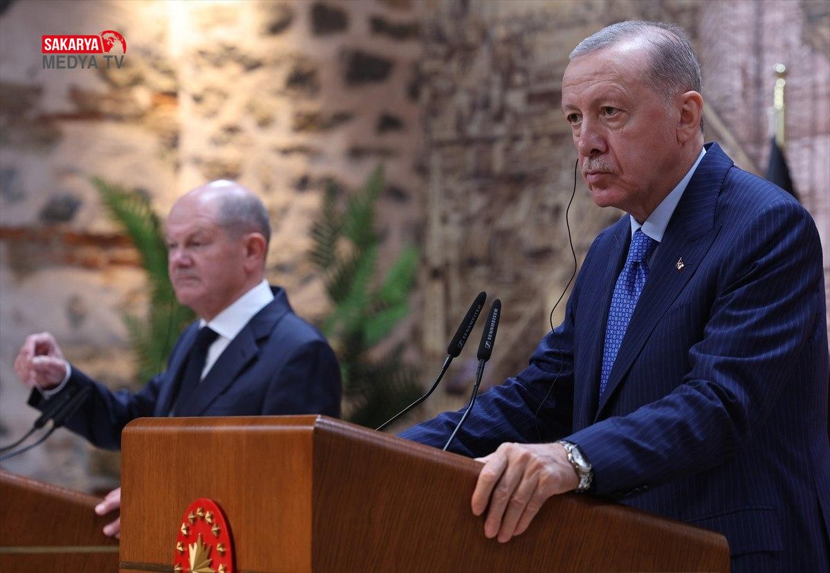 Basın toplantısında “İsrail’in kendini savunma hakkı var” ifadelerini kullanan Scholz’a Cumhurbaşkanı Erdoğan tarihi ayar verdi.