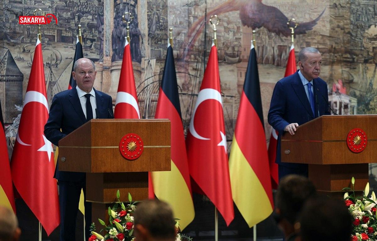 Şansölye Scholz’la üzerinde durduğumuz önemli konu başlıklarından biri de savunma sanayii alanındaki işbirliğimizdi. Savunma sanayii ürünlerinin tedariki bağlamında geçmişte yaşanan bazı sıkıntıları artık geride bırakarak işbirliğimizi geliştirmeyi arzu ediyoruz. Bu konuda değerli dostum Scholz’un gayretlerini takdirle karşıladığımızı bugün bir kez daha ifade etmek istiyorum.