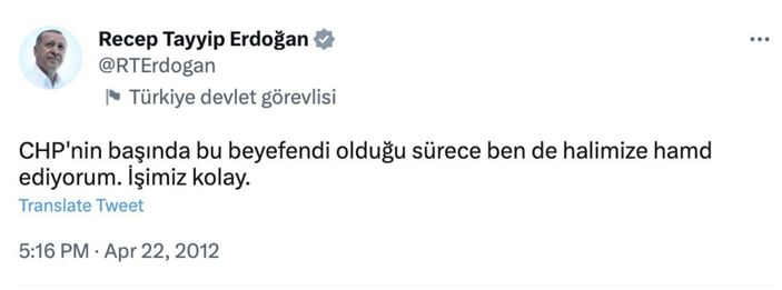 O dönem Türkiye Cumhuriyeti’nin Başbakanı olan Erdoğan’ın yaptığı bir paylaşımda “CHP’nin başında bu beyefendi olduğu sürece ben de halimize hamdediyorum. İşimiz kolay” ifadelerini kullandığı görüldü.