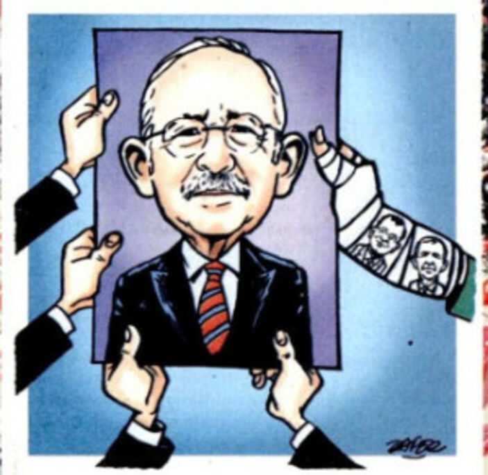 Kemal Kılıçdaroğlu’nun fotoğrafının kullanıldığı manşette diğer 5 liderin Kılıçdaroğlu’nun üzerinde ellerinin olduğu gözüktü.