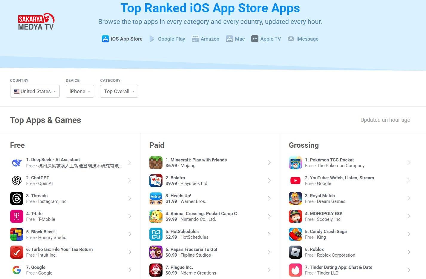 Çinli sohbet robotu DeepSeek, 120’den fazla ülkede App Store‘daki fiyatsız uygulamalar ortasında liderliğini sürdürmeye devam ediyor. Ayrıyeten indirme sayısı bakımından OpenAI’ın ChatGPT’sini geride bıraktı. DeepSeek uygulaması Avustralya, Avusturya, Belçika, Kanada, Kıbrıs, Danimarka, Estonya, Finlandiya, Fransa, Almanya, İngiltere, Yunanistan, İzlanda, Hindistan, Lüksemburg, Maldivler, Yeni Zelanda, Portekiz, Seyşeller, Singapur, İspanya, İsveç, İsviçre, Birleşik Arap Emirlikleri ve Birleşik Krallık üzere ülkelerde App Store listelerinin başında yer alıyor. Türkiye‘de ise Temu uygulamasının akabinde ikinci sırada.