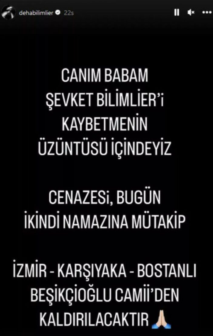 Ünlü şarkıcı Deha Bilimlier’in babası Şevket Bilimlier’den acı haber geldi. Şevket Bilimlier, hayata veda etti. Acı haberi ünlü şarkıcı, sosyal medya hesabından yayınladığı gönderiyle duyurdu.