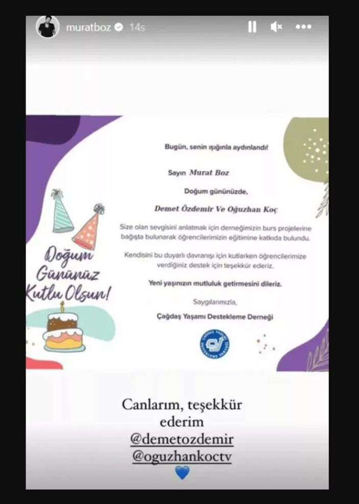 Depremlerin ilk gününden beri yardım için kolları sıvayan isimlerden olan Demet Özdemir-Oğuzhan Koç çifti, Murat Boz’un bu hareketine kayıtsız kalamadı. Ünlü çift, arkadaşlarının doğum günü için Çağdaş Yaşamı Destekleme Derneği’nin burs fonuna bağış yaptı.