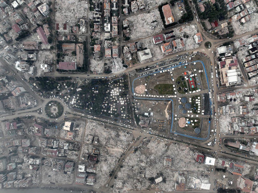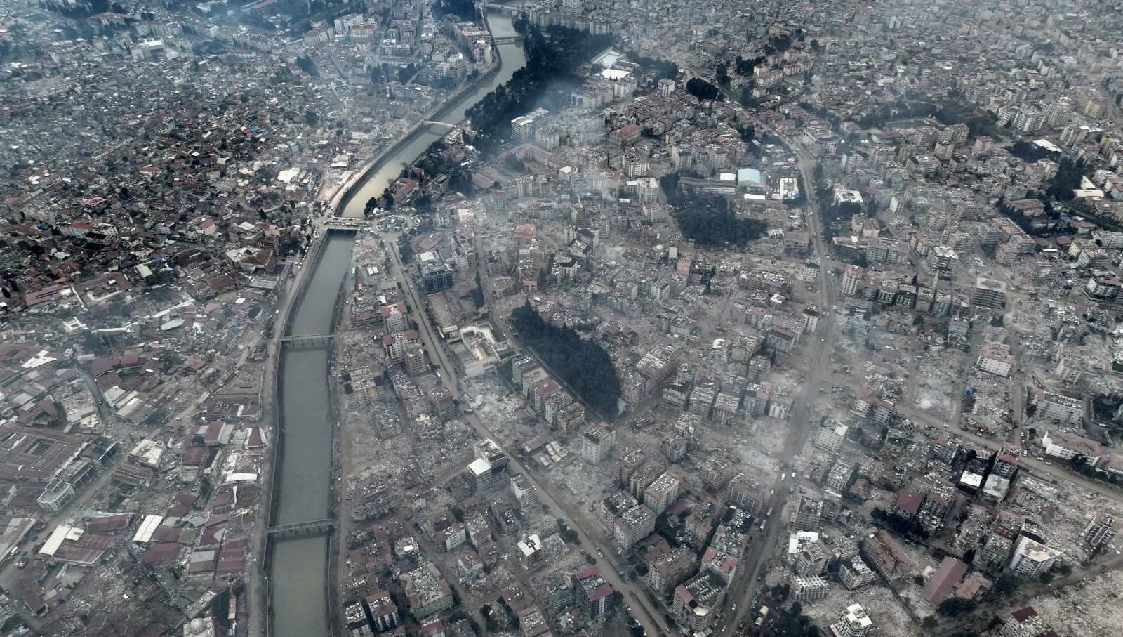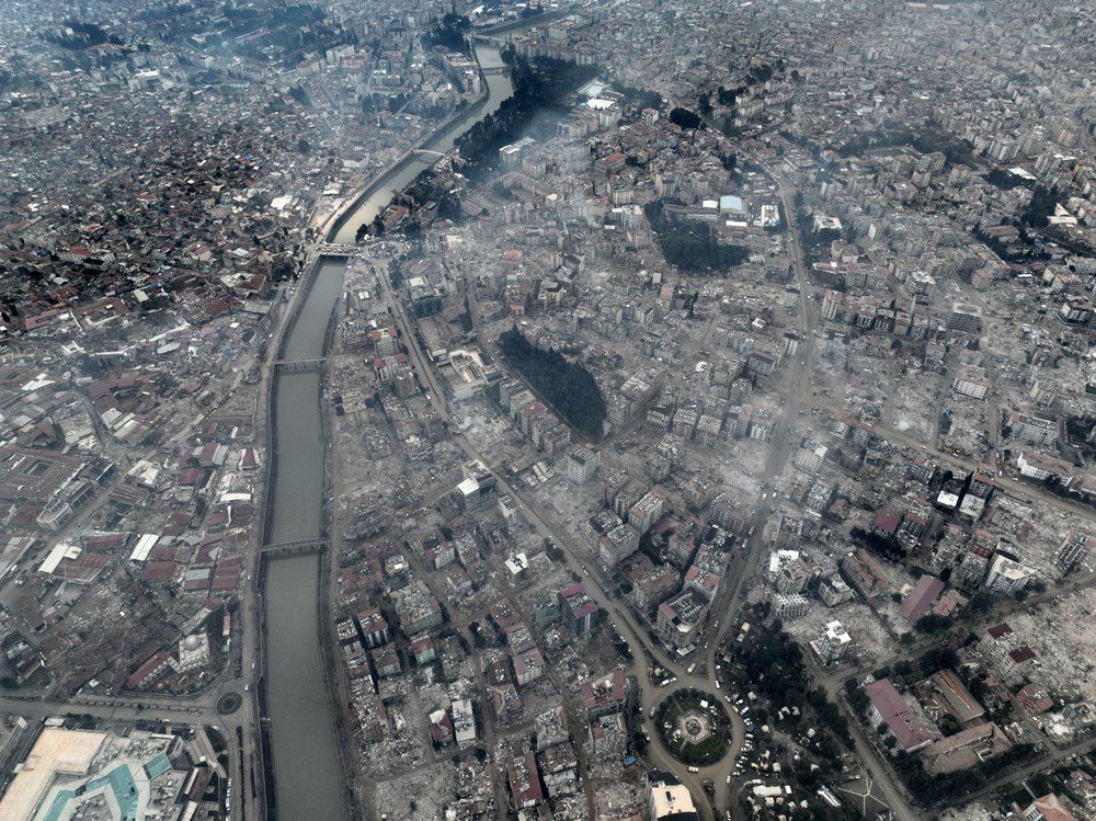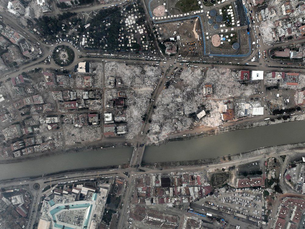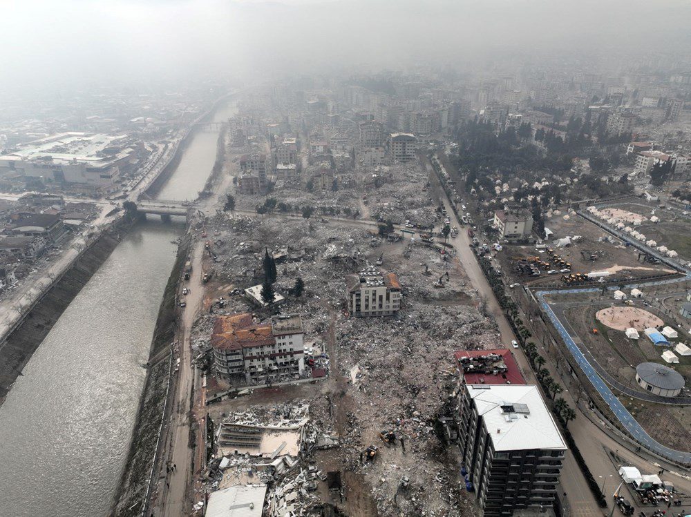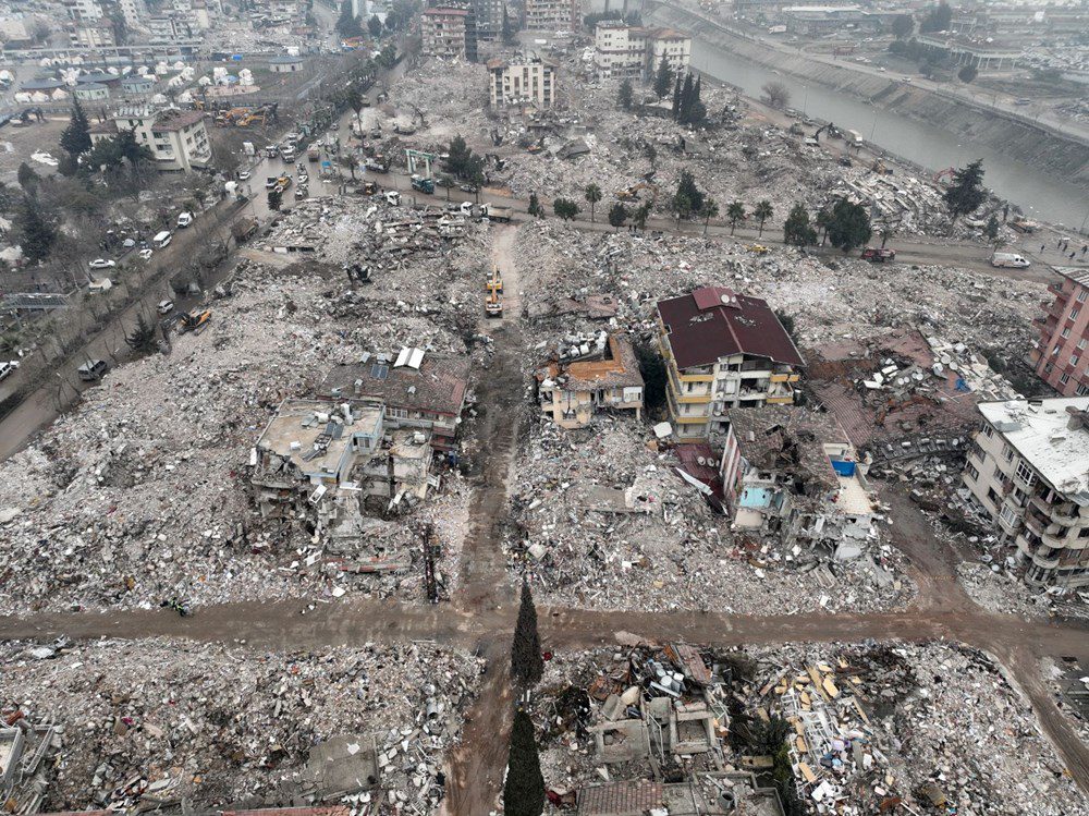 Binaların enkazları yollara dökülürken, şehrin aldığı hasar drone kamerasıyla kaydedildi.