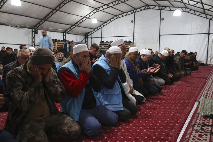 Adıyaman’da Eğriçay Parkı Çadır Kenti’ndeki depremzedeler ve görevliler, çadır mescid’de düzenlenen Berat Kandili programına katıldı.