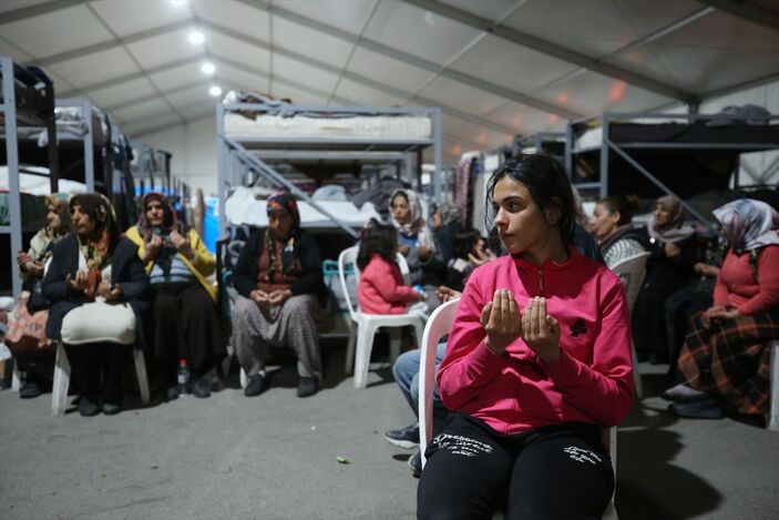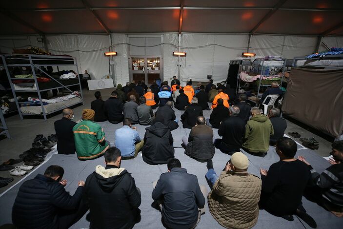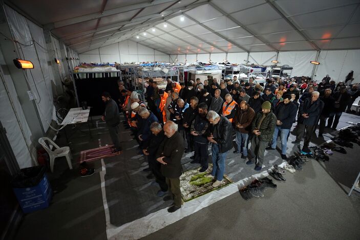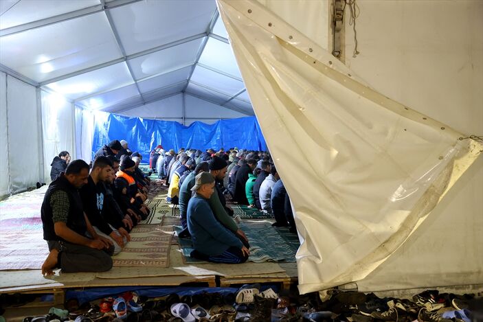 Osmaniye’de Tosyalı Sentetik Saha’ya kurulan geçici barınma merkezinde kalan vatandaşlar, Berat Kandili için merkezin yanında bulunan Tosyalı Camisi’ne geldi.