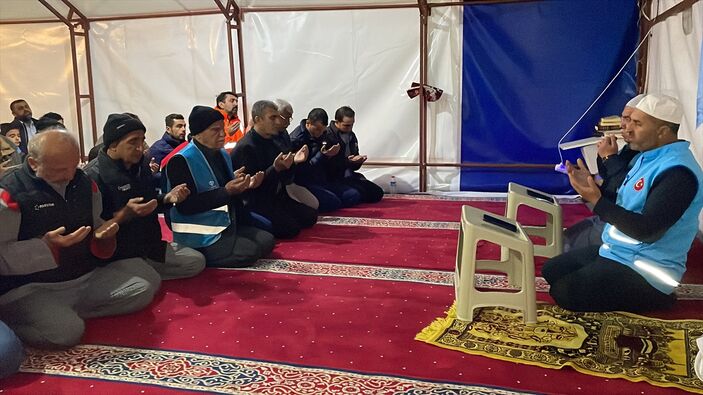 İzmir İl Müftülüğünden gelen görevlilerce Kur’an-ı Kerim tilaveti ve ilahiler okunmasının ardından depremde hayatını kaybedenler için dua edildi.