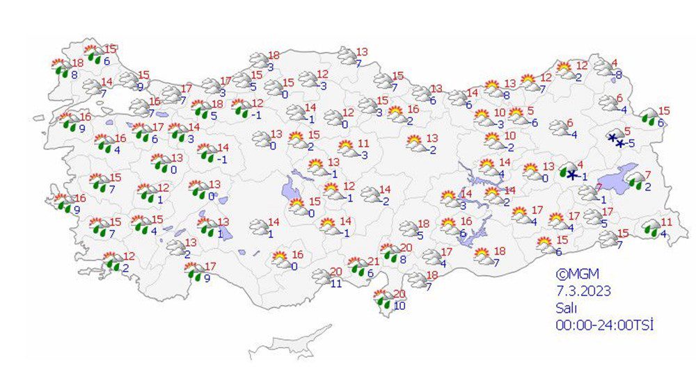 Ülkemiz genelinin parçalı ve yer yer çok bulutlu, Marmara (İstanbul hariç) ve Ege ile Antalya, Isparta, Adana, Osmaniye, Hatay, Eskişehir, Ağrı, Van ve Hakkari çevrelerinin yağmur ve sağanak yağışlı, Hakkari, Ağrı ve Van’ın yüksek kesimlerinin karla karışık yağmur ve yer yer kar yağışlı geçeceği tahmin ediliyor.
