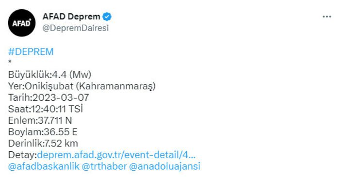 AFAD’dan edinilen bilgiye göre, Kahramanmaraş’ta saat 12.40’ta yerin 7.52 kilometre derinliğinde 4.4 büyüklüğünde bir deprem yaşandı.