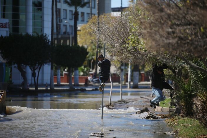Öte yandan, Kahramanmaraş merkezli 6 Şubat’taki depremlerin ardından kıyı bandının zarar gördüğü ilçede lodosun etkisiyle yükselen deniz sularının caddelere kadar gelmesi nedeniyle belediye ekipleri çalışma yapıyor.