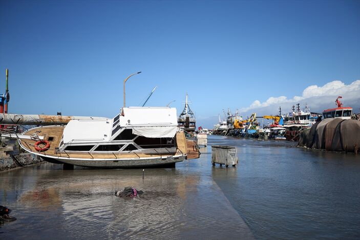 Balıkçılardan bazılar da teknelerinin batmaması için çalışma yapıyor.