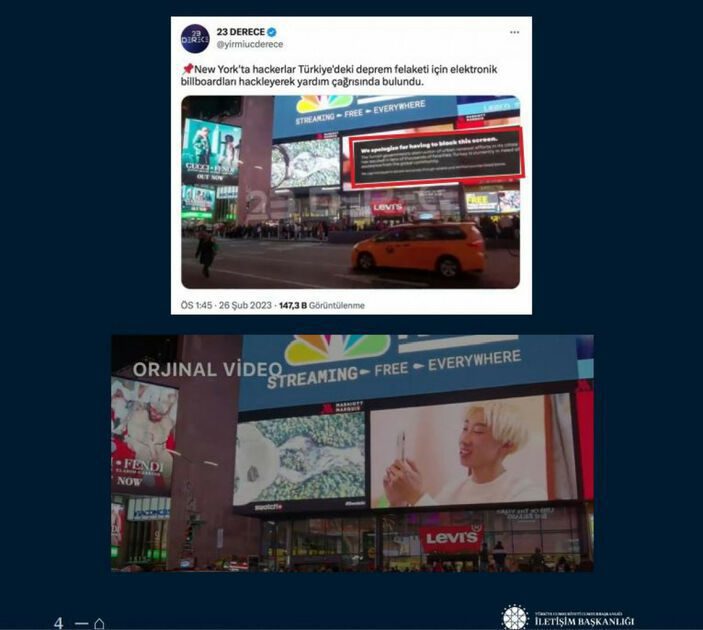 Bültende, Türkiye’ye yönelik yardım çağrısında bulunmak için ABD’nin New York şehrindeki billbord’ların ‘hack’lendiğine ilişkin görüntülerin gerçek olmadığı belirtilerek şu ifadelere yer verildi: