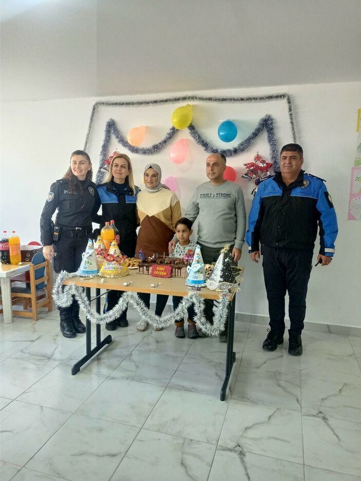 Gazipaşa İlçe Emniyet Müdürlüğünde görevli polisler koordinesinde yapılan kutlamaya, Miraç’ın ailesi ile diğer afetzede çocuklar da katıldı.
