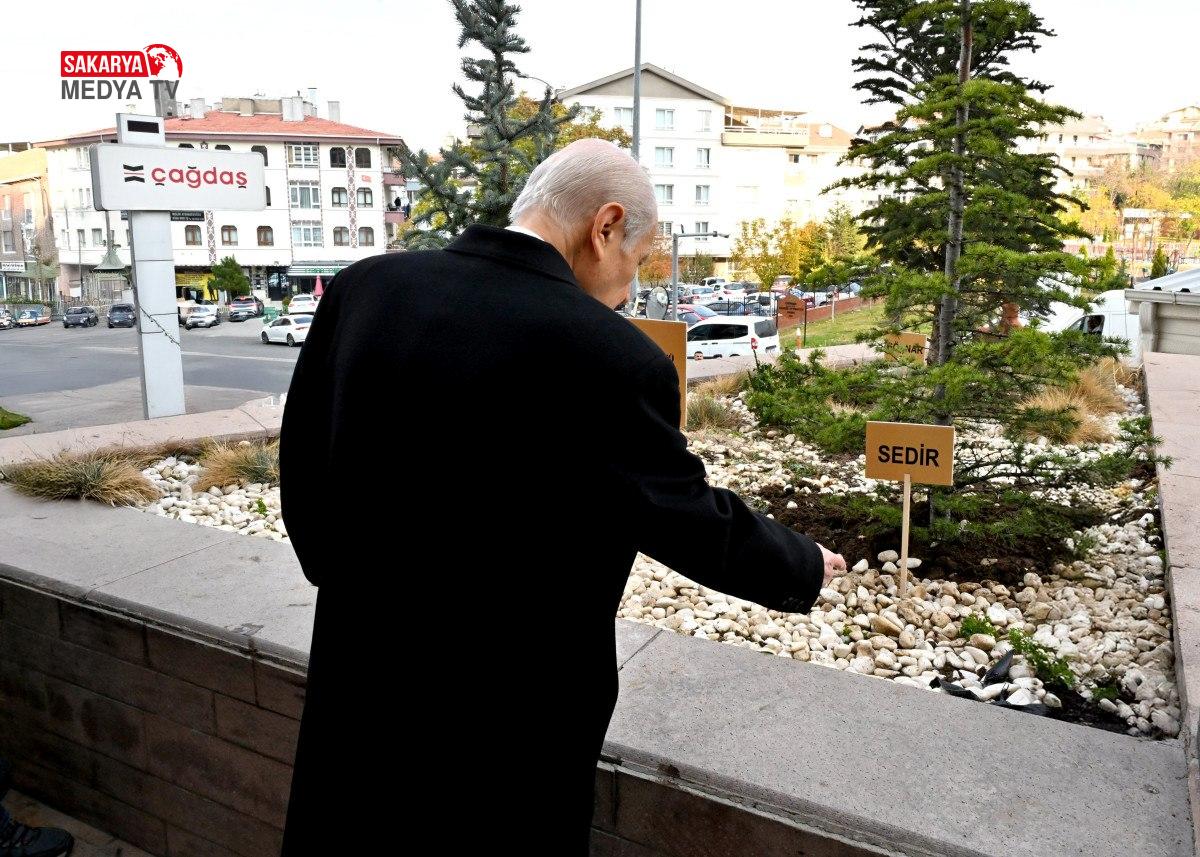 Bahçeli de ağaçların önünde poz verirken, MHP’nin bilgi sayfasından detaylar paylaşıldı.