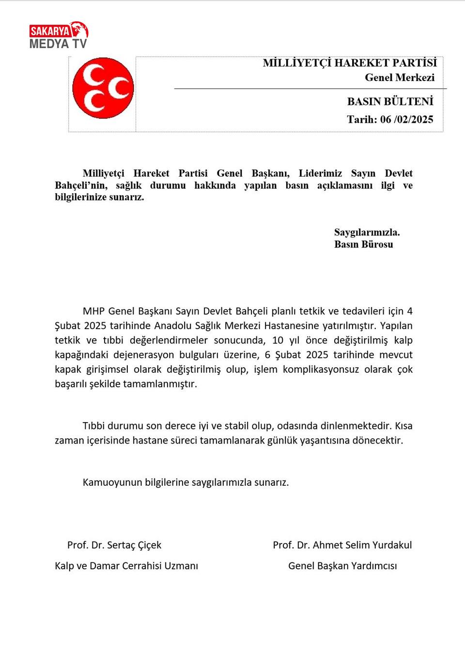 MHP Genel Başkanı Devlet Bahçeli’nin kalp kapakçığının değiştirildiği ve sürecin muvaffakiyetle tamamlandığı açıklandı.