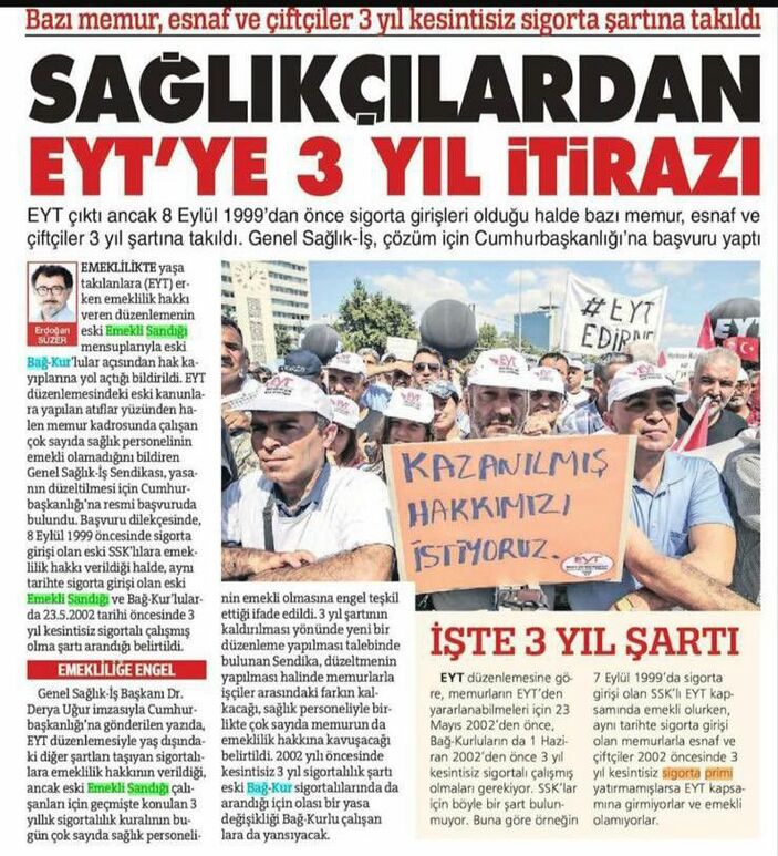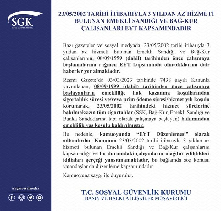 “Bazı memur, esnaf ve çiftçiler EYT’de 3 yıl kesintisiz sigorta şartına takıldı” iddiası doğru değildir. HAKİKAT: 3 Mart 2023 tarihli Resmi Gazetede yayımlanan EYT düzenlemesiyle 8 Eylül 1999 (dahil) tarihinden önce çalışmaya başlayanlardan prim gün ve çalışma süresini dolduranlar, yaş şartı aranmaksızın emekli olma hakkına sahiptir. Emekli Sandığına bağlı çalışanların 23 Mayıs 2002’den önce, Bağ-Kurluların ise 1 Haziran 2002’den önce 3 yıl kesintisiz sigortalı çalışmış olması şartının getirildiği iddiası gerçeği yansıtmamakta olup, bu şartı sağlamayan vatandaşlar da EYT düzenlemesi kapsamındadır.