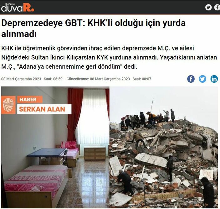 isimli şahıs, ailesi ile birlikte diğer tüm depremzedelerimiz gibi barınma/ konaklama müracaatlarının alındığı Niğde Gençlik ve Spor İl Müdürlüğü’ne bağlı Sultan 1. Kılıçarslan Yurdu’nda bulunan KYK görevlilerine 24 Şubat 2023 günü müracaatta bulunmuştur. Müracaatın hemen akabinde diğer depremzede vatandaşlarımızın da konakladığı Ertuğrul Gazi KYK yurduna yönlendirilerek aynı gün kayıtları yapılmıştır. Ancak M.Ç.