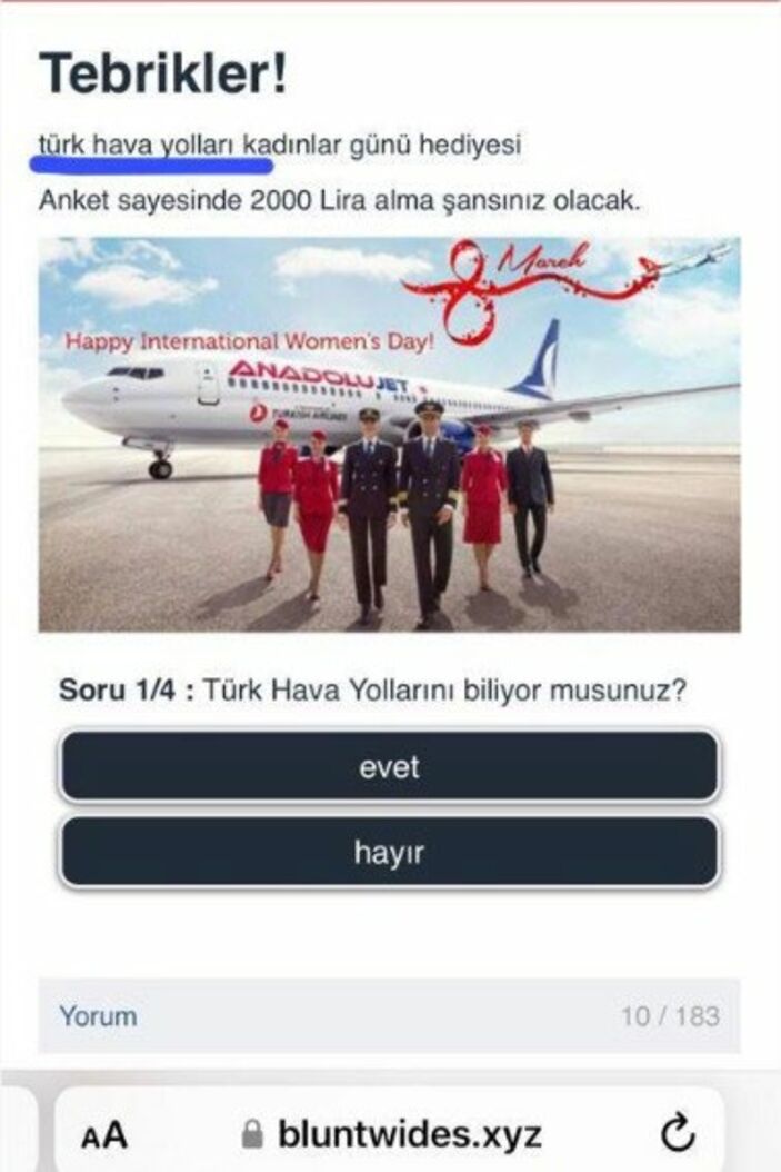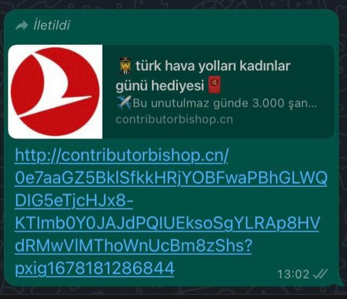 Bazı haberleşme uygulamalarında, “Türk Hava Yolları Kadınlar Günü Hediyesi” başlığıyla yapılan paylaşımlar, dolandırıcılık amaçlıdır. HAKİKAT: Dolandırıcılar, ‘para ödülü’ gibi vaatler ve inandırıcılığı artırmak amacıyla kadınlar günü gibi özel günler belirterek dikkat çekmeye çalışmaktadır.