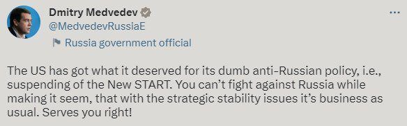 Medvedev, Twitter hesabından yaptığı paylaşımda, ABD’ye meydan okudu:ABD, aptal Rus karşıtı politikası nedeniyle hak ettiğini aldı. Mesela; New START’ın askıya alınması.