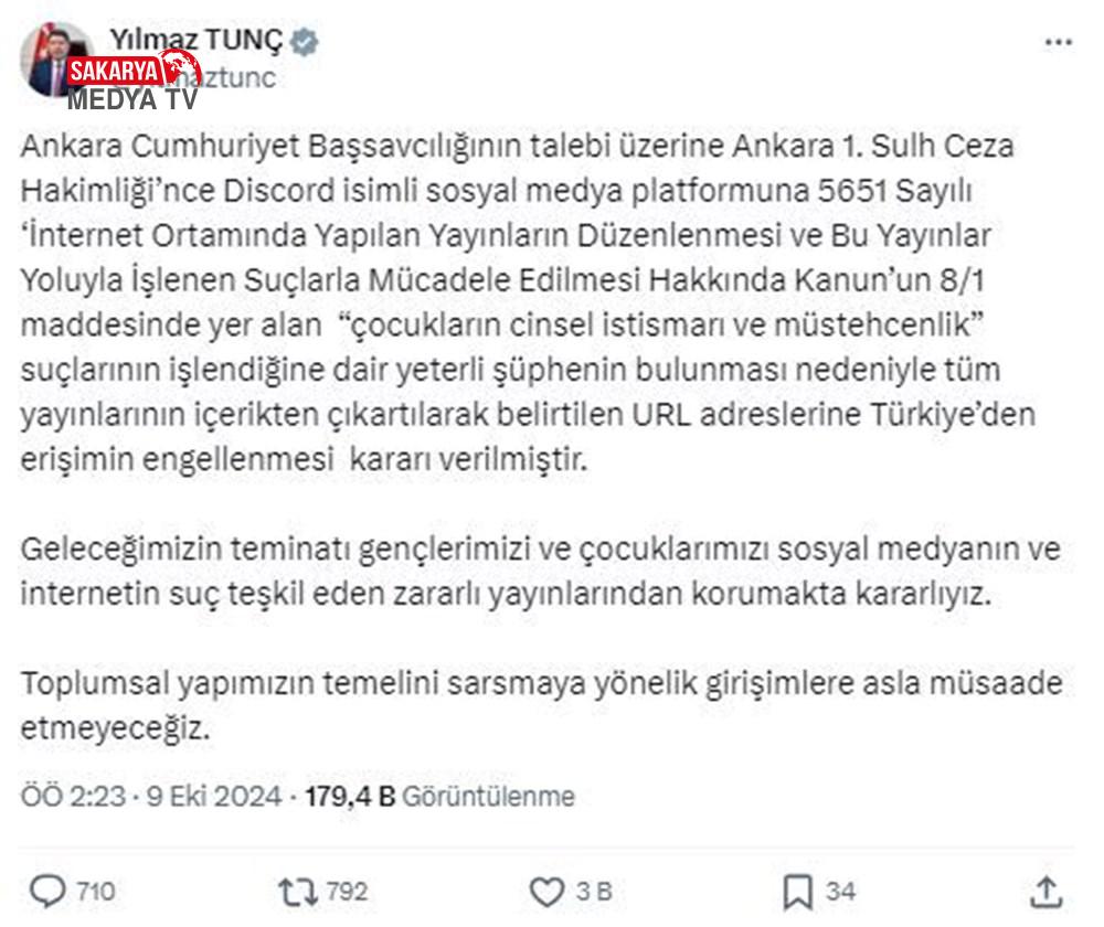 Bakan Tunç, sosyal medya hesabından yaptığı açıklamada, Discord isimli toplumsal medya platformunda 5651 Sayılı “İnternet ortamında yapılan yayınların düzenlenmesi ve bu yayınlar yoluyla işlenen hatalarla çaba edilmesi” hakkında kanunun 8/1 unsurunda yer alan “çocukların cinsel istismarı ve müstehcenlik” hatalarının işlendiğine dair kâfi kuşkunun bulunduğunu belirtti.
