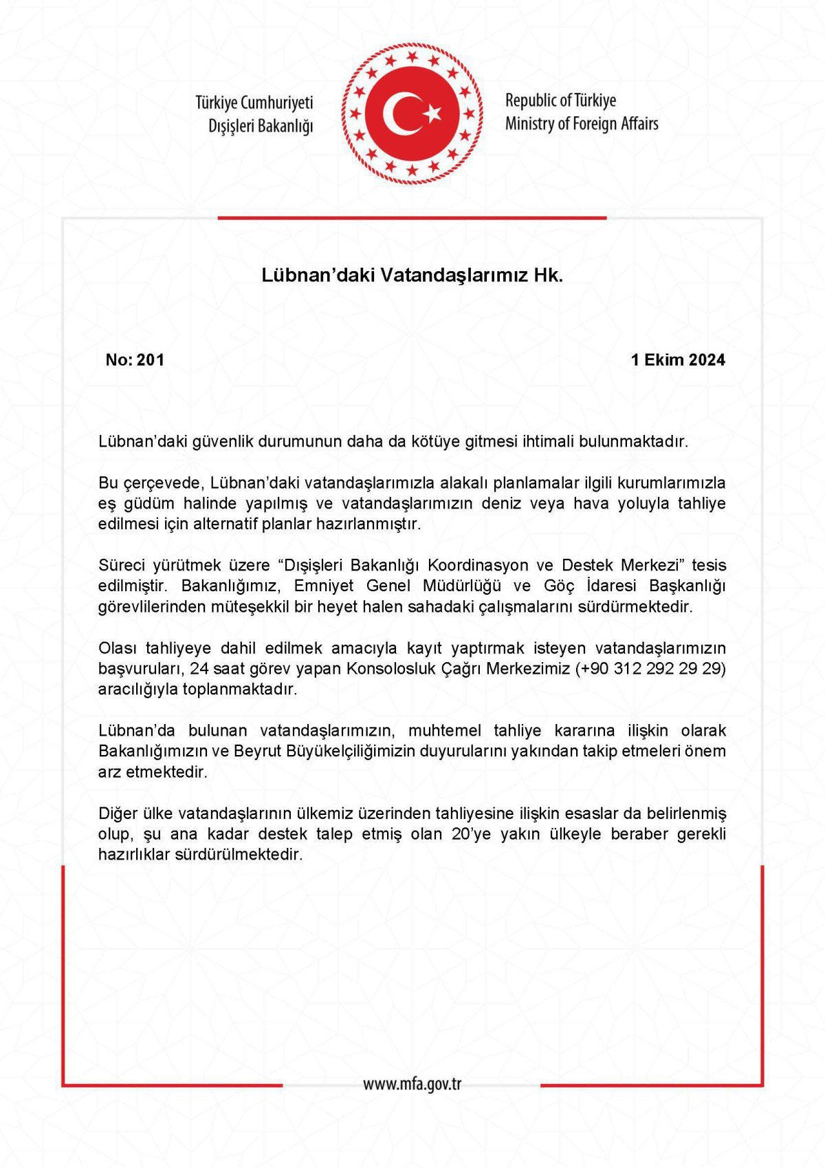 Lübnan’da bulunan vatandaşlarımızın, mümkün tahliye kararına ait olarak Bakanlığımızın ve Beyrut Büyükelçiliğimizin duyurularını yakından takip etmeleri ehemmiyet arz etmektedir.