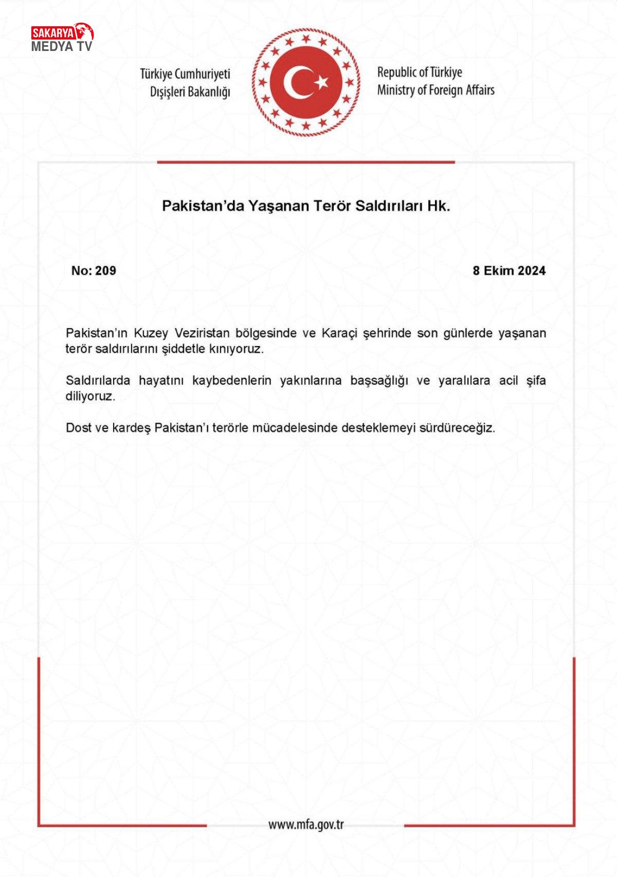 Saldırılarda hayatını kaybedenlerin yakınlarına başsağlığı, yaralılara acil şifalar dileyen Bakanlık, Türkiye’nin, Pakistan’ı terörle uğraş konusunda desteklemeye devam edeceğinin altını çizdi.
