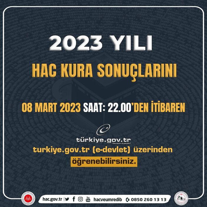 2023 yılı hac kura sonuçlarını bugün saat 22.00’den itibaren e-Devlet üzerinden öğrenebilirsiniz.