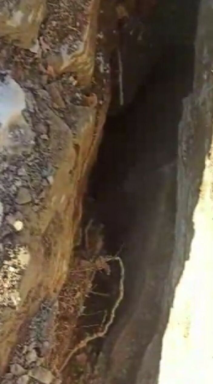 Köy sakinlerinin görüntülediği metrelerce uzunluktaki fay kırıklarının olduğu bölgede derin yarıklar ve çukurlar görülüyor.