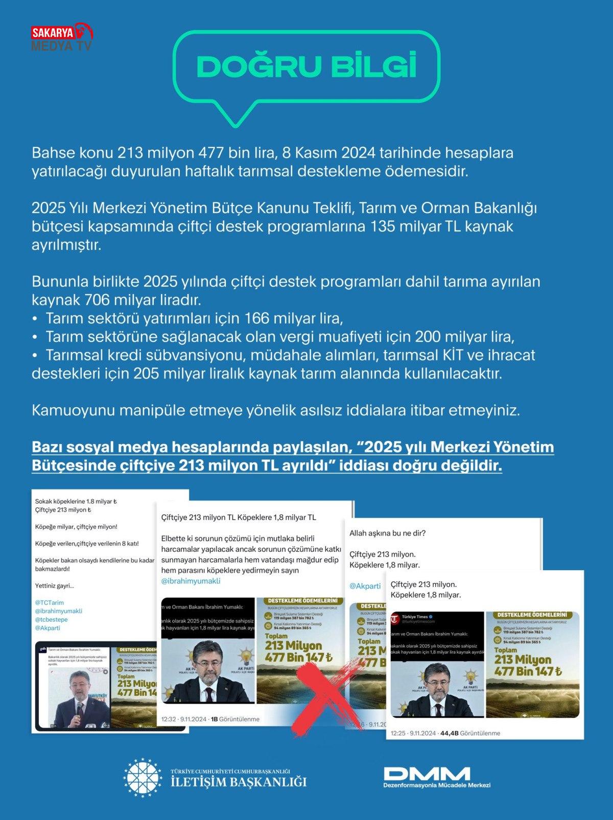 Bazı toplumsal medya hesaplarında “2025 yılı Merkezi İdare Bütçesinde çiftçiye 213 milyon TL ayrıldı” argümanı dolaşıyordu.