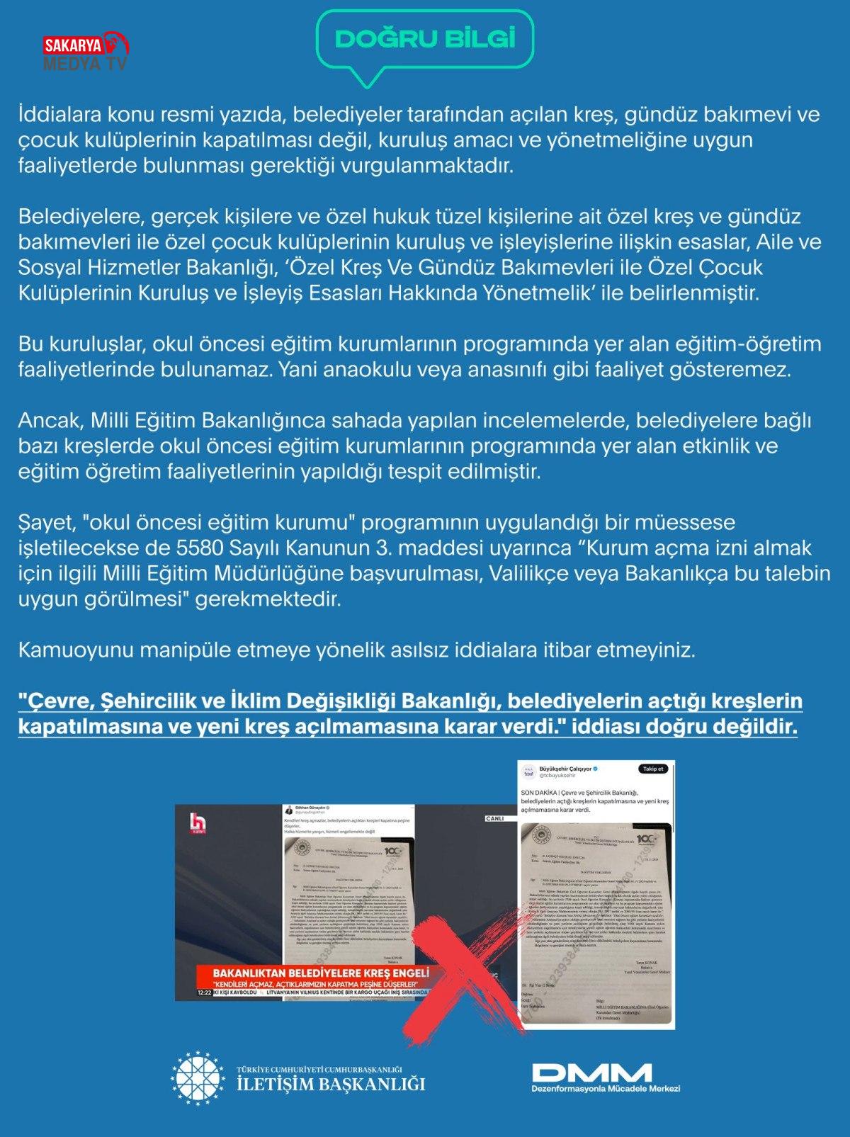 Bazı medya organlarında yer alan “Çevre, Şehircilik ve İklim Değişikliği Bakanlığı, belediyelerin açtığı kreşlerin kapatılmasına ve yeni kreş açılmamasına karar verdi.” şeklindeki iddialar hızla yayılarak kısa sürede gündem oldu…
