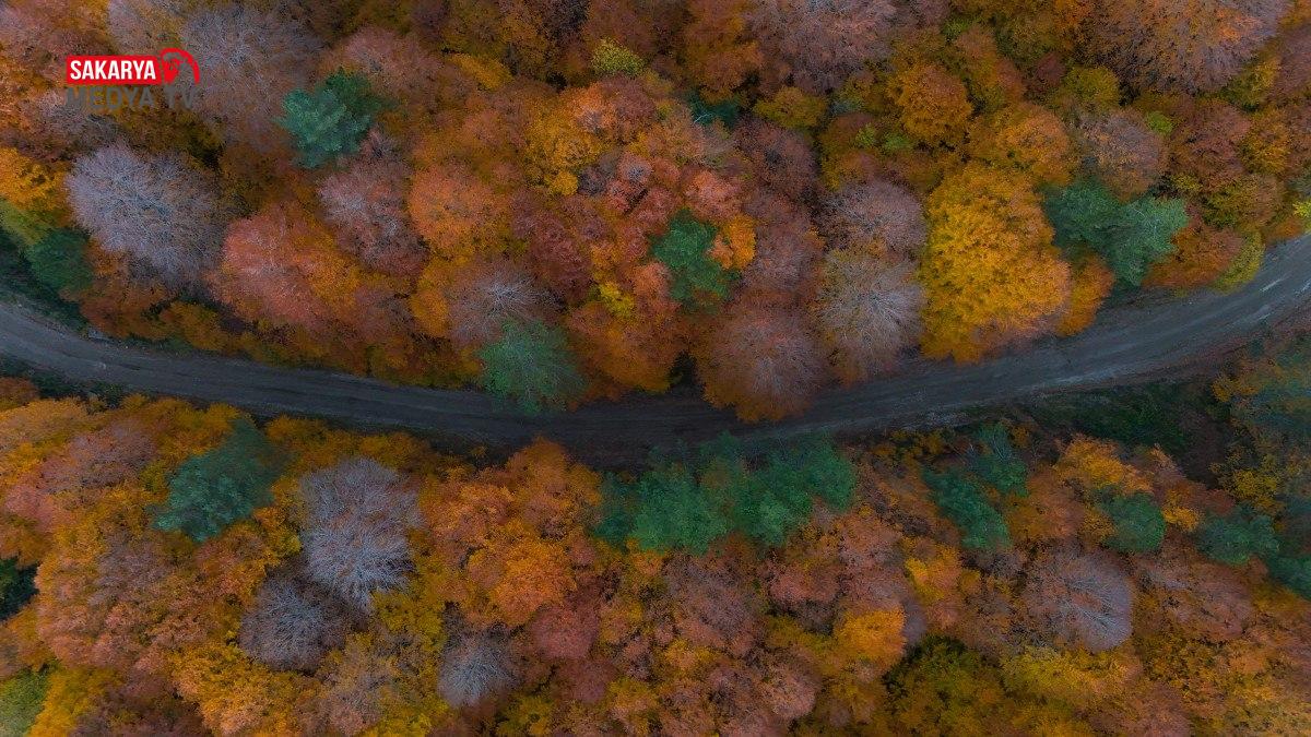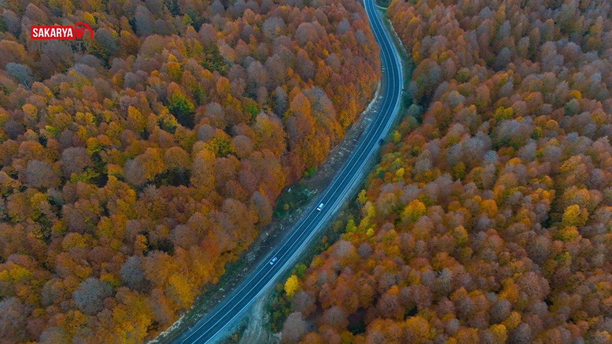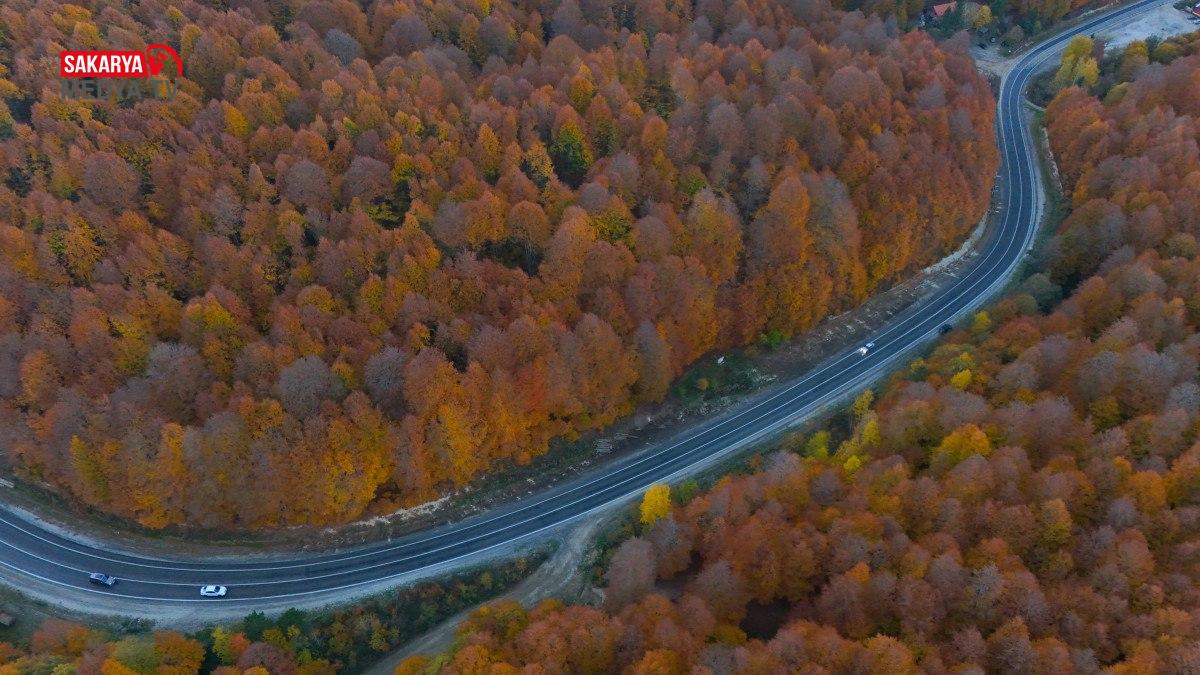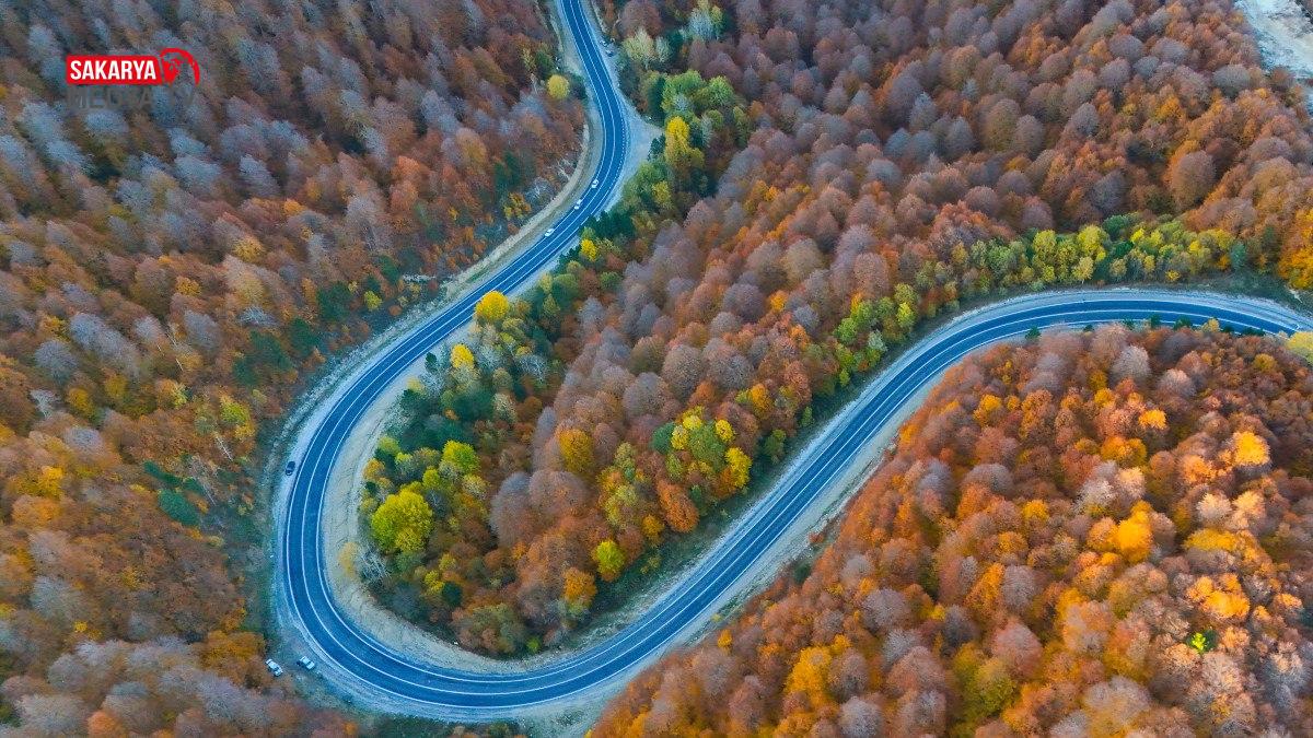 Sürücüler, sonbahar renklerine bürünen yolun keyfini çıkararak seyahat yapıyor.