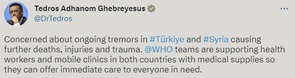 Ghebreyesus, “Türkiye’de ve Suriye’de devam eden ve daha fazla ölüm, yaralanma ve travmaya neden olan sarsıntılardan endişe duyuyoruz.” dedi.
