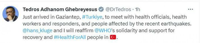 Bölgedeki çalışmaları gözlemlemek amacıyla Gaziantep’e gelen DSÖ Genel Direktörü Dr Tedros Adhanom Ghebreyesus, gelişiyle ilgili şu ifadeleri paylaştı: