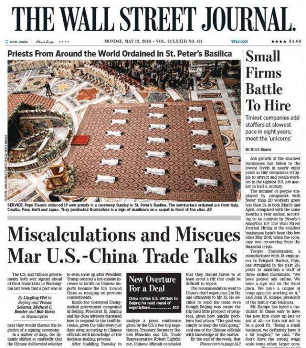 Katolik dünyasının ruhani lideri ve Vatikan Devlet Başkanı Papa Francis, Presbiteryen rahiplerin yemin ritüellerinin gerçekleştirildiği bir törene katıldı. Törende rahiplerin Papa Francis’in önünde diz çöküp uzanarak Katolik Kilisesi liderine olan bağlılıklarını göstermesi, WSJ’ın manşet konusuydu. ABD-Çin ticaret savaşında iki ülke arasında devam eden karşılıklı açıklamalar da gazetenin gündemindeydi. Buna göre Washington, Çin yasalarında somut değişiklik sözleri talep ederken, Çin hükümeti çıkarlarına zarar veren herhangi olumsuz bir duruma katlanmayacağını belirtti.