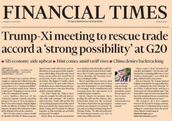 ABD Başkanı Donald Trump’ın, Çin Devlet Başkanı Şi Cinping ile haziran sonunda Japonya’da yapılacak G20 Zirvesi’nde görüşebileceği açıklamaları, gazetenin manşetindeydi.