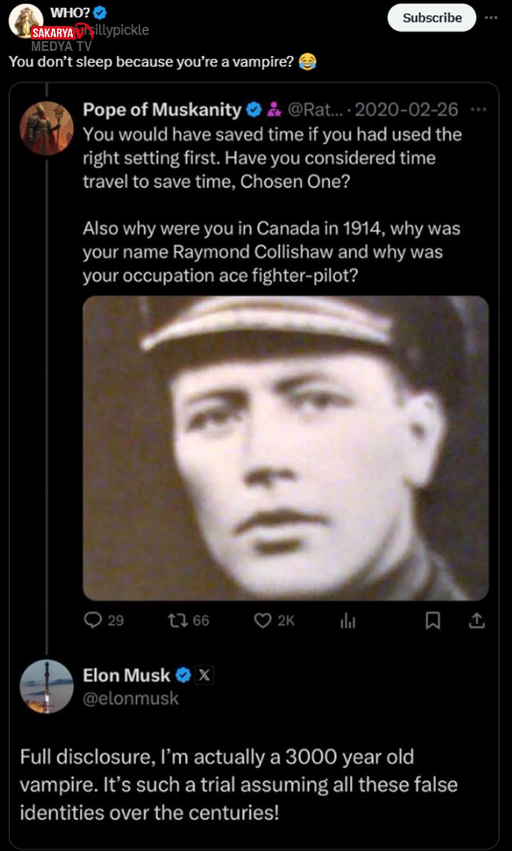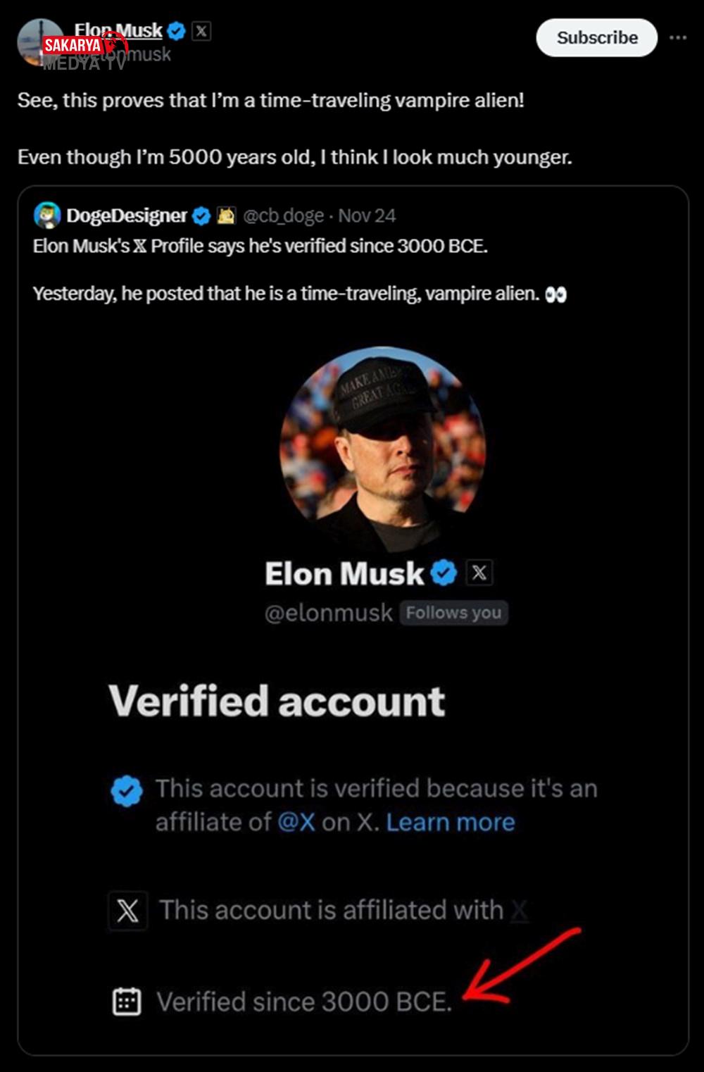 3000’den beri doğrulandı” sözünü içeren paylaşımı gündem oldu. Musk, gönderiye “Bakın, bu benim vakitte seyahat eden bir uzaylı vampir olduğumu kanıtlıyor!” diyrek cevap verdi ve “5000 yaşında olmama karşın çok daha genç göründüğümü düşünüyorum” dedi. Musk’ın M.Ö.