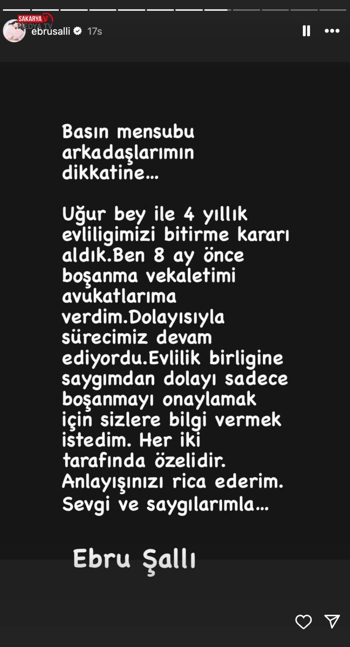Şallı “Uğur Bey ile 4 yıllık evliliğimizi bitirme kararı aldık. Ben 8 ay evvel boşanma vekaletimi avukatlarıma verdim.