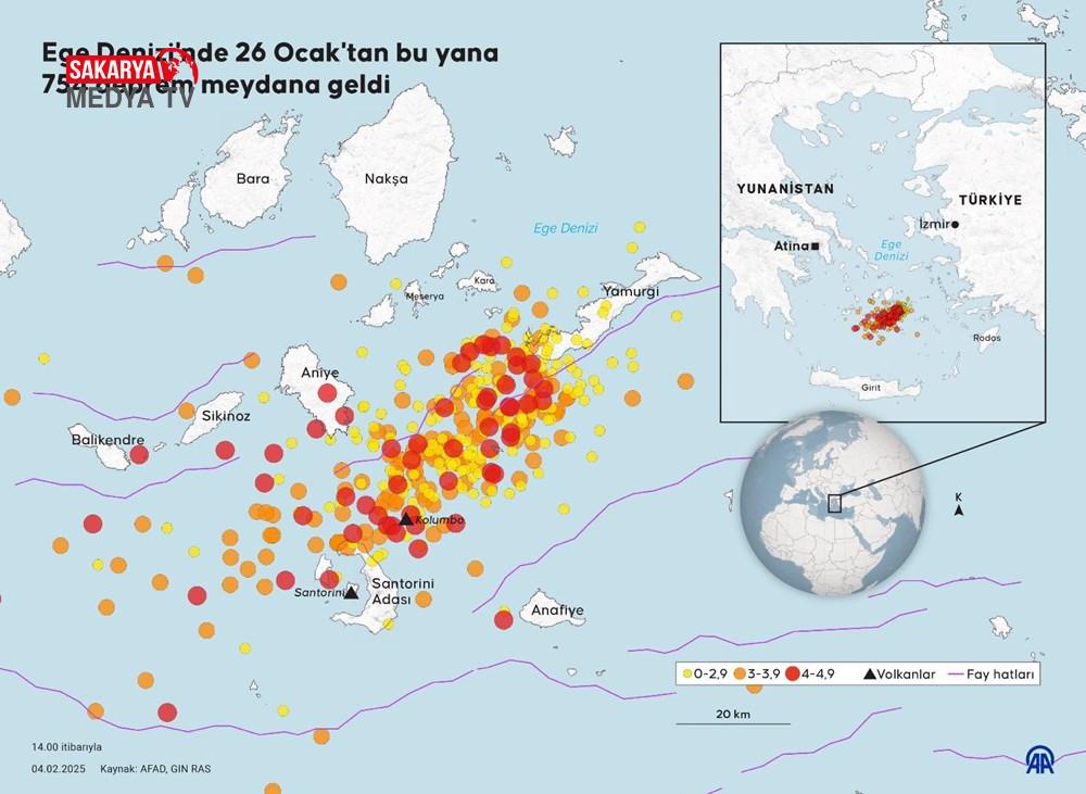 Afet ve Acil Durum Yönetimi Başkanlığının (AFAD) verilerine göre, 28 Ocak’tan beri saat 14.00 itibarıyla Ege Denizi’nde 754 deprem kayıtlara geçti. Deprem fırtınası şeklinde gelişen bu aktivite sonucunda büyüklüğü 1’den küçük 1, 1-2 arası 109, 2-3 arası 293, 3-4 arası 294 ve 4-5 arası 57 deprem meydana geldi.