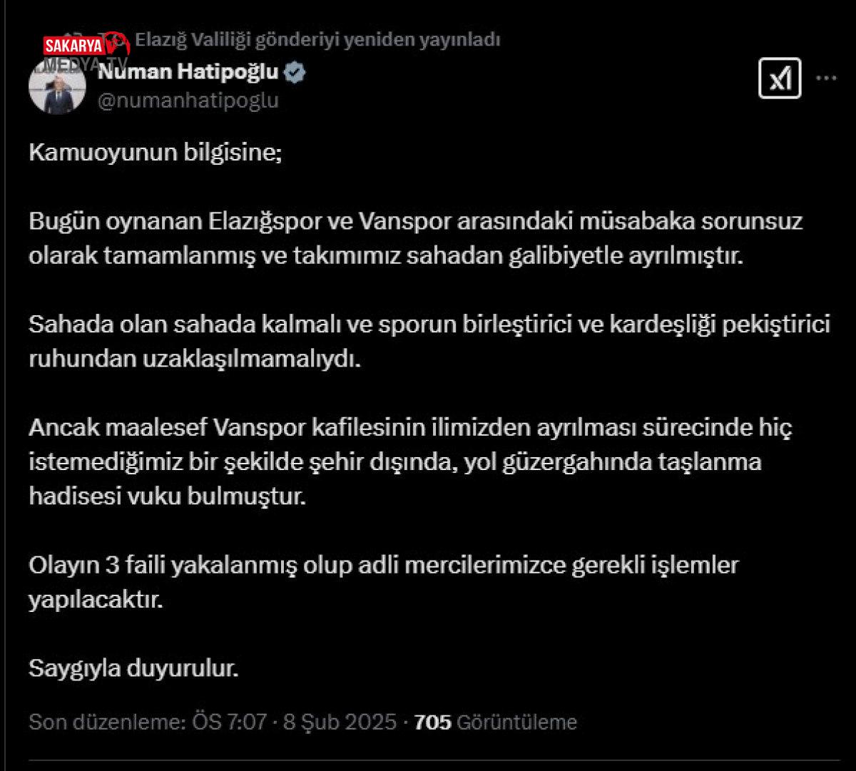 Vali Numan Hatipoğlu toplumsal medya hesabından yaptığı açıklamada olayla ilgili 3 şüphelinin gözaltına alındığını belirterek, şunları dedi:Bugün oynanan Elazığspor ve Vanspor ortasındaki karşılaşma sıkıntısız olarak tamamlanmış ve ekibimiz alandan galibiyetle ayrılmıştır.
